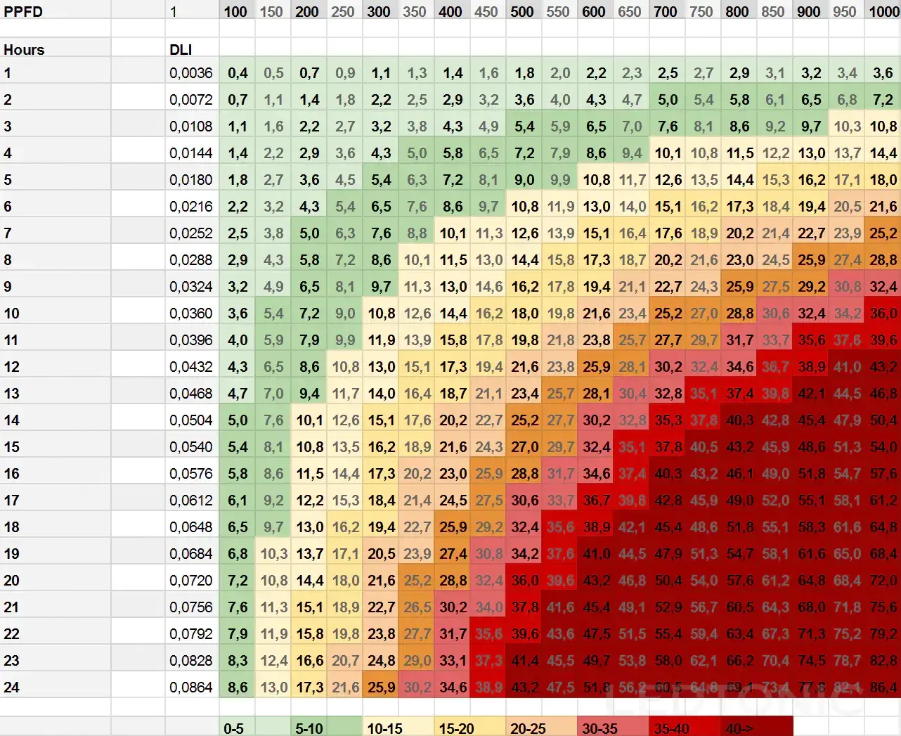 Besonders Lichtintensive Pflanzen wie z.B. Cannabis benötigen in der Vegetativen Phase und der Blütephase zwischen 30 – 40 DLI. Diese Werte lassen sich erreichen, indem die Beleuchtungsdauer der Lichtquelle an die individuellen Bedürfnisse der Pflanze angepasst wird.